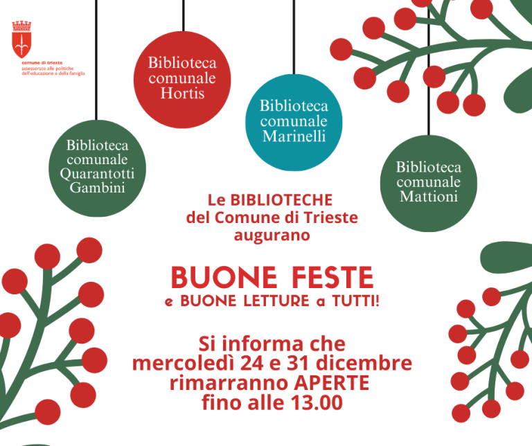 CHIUSURE ANTICIPATE mercoledì 24 e 31 dicembre 19 Dicembre 2025 Il Servizio Scuola, Educazione e Biblioteche del Comune di Trieste informa tutti gli utenti che mercoledì 24 e 31 dicembre 2025 le Biblioteche Hortis, Quarantotti Gambini, Mattioni,